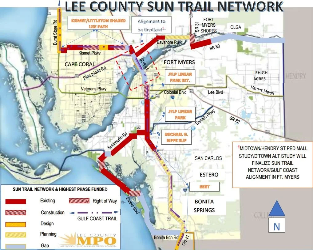Local government plans such as the City of Fort Myers Midtown Plan recognize the value and importance of the Florida Gulf Coast Trail and they are considering the route in their plans through Midtown. The John Yarbrough Linear Park and its proposed extension to central Fort Myers is along the Florida Gulf Coast Trail. The City’s Hendry Street Pedestrian Mall concept complements the efforts to run the SUN Trail Network and the Gulf Coast Trail through Downtown and Midtown. The city and the Lee County BOCC both support MPO’s planned Caloosahatchee Downtown Multimodal Alternative Study that will evaluate alternative options for a preferred alternative for the Gulf Coast Trail that does not bypass the Downtown River District and the planned North Fort Myers Town Center Plan.